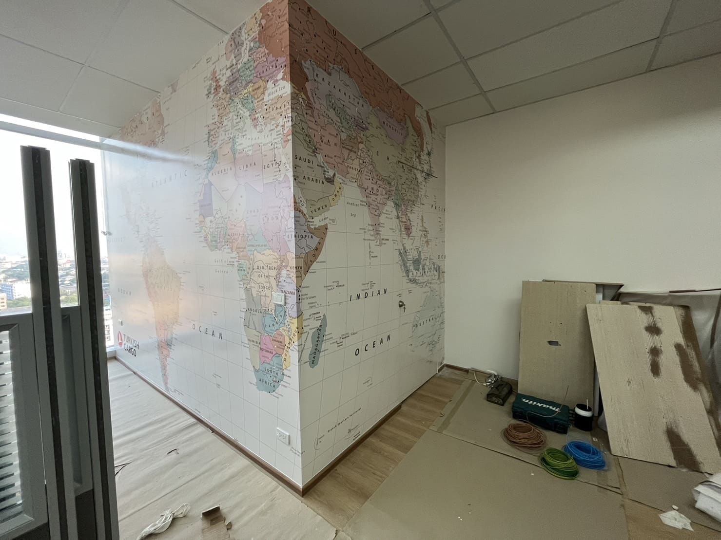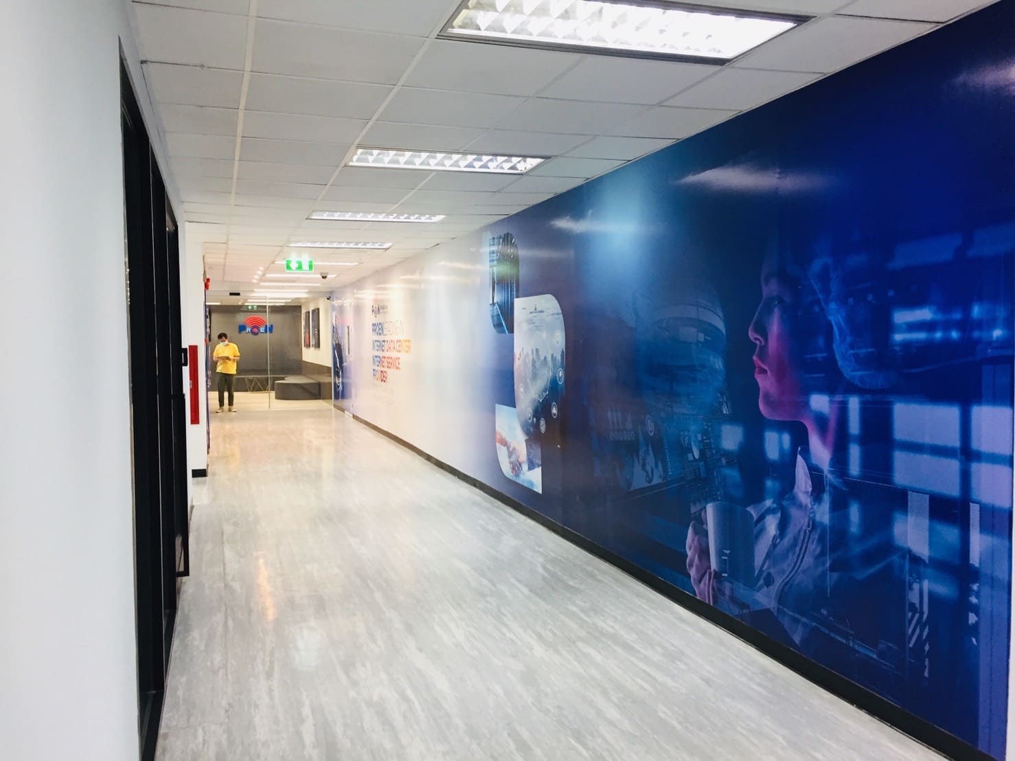 การทำ สติ๊กเกอร์กราฟิกติดผนังออฟฟิศ ช่วยสร้างมิติให้กับผนังห้องทำงานเดิมๆ นอกจากนี้เรายังมีบริการ พิมพ์วอลเปเปอร์สติ๊กเกอร์สำนักงาน ที่ช่วยปกปิดรอยร้าวหรือความไม่สม่ำเสมอของผนังปูนได้เป็นอย่างดี